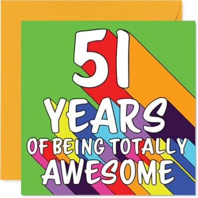 MAKE THEM SMILE WITH THIS UNIQUE BIRTHDAY CARD: This exceptional quality birthday card for him or her shows the design '51 YEARS OF BEING TOTALLY AWESOME'. If you are looking for special birthday greetings cards for Men birthday card then then this happy birthday card is bound to make them smile. Not just for birthday gifts for Men this could also be for Cousin, Brother, Nanny, Nan, Colleague, Dad, Neighbour or Daughter. WHAT DO YOU GET: The card is printed on one side and BLANK ON THE INSIDE to allow you to write your very own message. The unique fun design is printed on a specially sourced and environmentally responsible board. At 360 microns thick the natural white one-sided gloss board has a quality look and feel. Supplied with a coloured gummed envelope to complement the design and ready to be sealed and sent in the post. Great Cousin birthday cards, Brother birthday card. DESIGNED FOR WRITING: There is nothing worse than writing inside a card to find that the shiny surface makes the ink smudge. This is why we use a high quality one sided coated board. The uncoated side will absorb more of the ink from your pen to make smudging a thing of the past. 51st Birthday card for Nanny, 51st Birthday card for Nan, 51st Birthday card for Colleague. SIZES: Greeting Card = 145mm x 145mm, Envelope = 155mm x 155mm, Card Thickness = 360 micron. Dad 51st birthday card, birthday cards for Neighbour, special birthday cards for Daughter, 51st birthday card Cousin, Brother 51st birthday card. MADE AND QUALITY CHECKED IN THE UK: We print and manufacture all our products right here in the UK so you can be sure of a fast turnaround and a product that is expertly made. Using environmentally responsible premium board our card is conscious of the responsible management of the world's forests - perfect birthday cards for Men, fun birthday cards for him, Brother 51st birthday cards, female birthday cards.