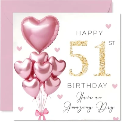 51st Birthday Cards for Women Pink Glitter Balloons Happy Card 51 Year Old Woman Cousin Wife Sister Friend, 145mm Bday Greeting