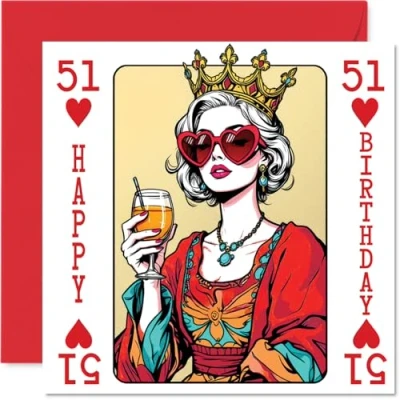 51st Birthday Cards for Women Queen Playing Card Happy 51 Year Old Woman Nan Colleague Friend Grandma, 145mm Bday Greeting