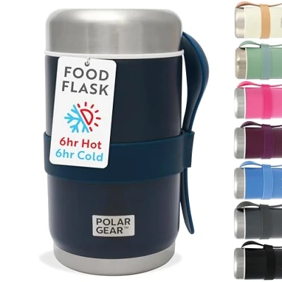 Upgraded 520ml Capacity Soup Flask: Polar Gear's thermal food container now offers a larger 520ml capacity, providing more space for your favourite hot or cold meals, perfect for longer trips or more satisfying portions, ensuring you stay nourished and energized throughout the day. Up To 6 Hours Hot Or Cold: Our insulated food container ensures food stays piping hot for up to 6 hours - perfect for hot pot recipes. For best results, simply pre-heat the thermal food flask before use by adding hot water 5 minutes before use. Need your food to stay nice and cold? Pre-cool with ice-cold water - it'll stay cool up to 6 hours. Just pour out the hot or cold water and the double-layered stainless steel will do the rest, so your food or drink stays the perfect temperature. Zero Spills, Leaks Or Condensation: Thanks to the extra thick double-walled insulation, forget condensation, heat transfer or sweating of your food on the outside of your insulated food jars. Your insulated food flask will stay at room temperature on the outside and the perfect temp inside, so no burning or freezing your fingers when holding. The vacuum flasks also have a leakproof screw lid so as long as it’s closed properly, no matter how bumpy the road is, there’ll be no sticky mess or stains! Soup Made Simple: No more losing cutlery from home, our compact soup container comes with a durable PP spoon which is cleverly held by the silicone band around the hot food containers. If you don’t need the spoon, the hot food lunch box has an extra wide mouth so you can sip away without making a mess. The non-slip silicone band also allows for easy opening and extra grip, so forget spilling food or drink when on the go! Economical 2-In-1 Flask For Hot & Cold Food Or Drinks: Whether you want food or drink on the go, our thermal lunch box for hot food does it all, eliminating the need for several drink and food containers as well as reducing single-use plastic packaging. Help the environment by saying no to one-use plastics and go for reusable multi-purpose items like our 304-grade, food and drink-safe hot lunch box. Helping the planet has never been so easy… or so sleek! Hand wash only, not dishwasher safe. Contents will remain very hot, take extra care if consuming hot food directly from the flask.