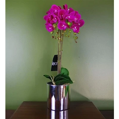 Amazon MarketplaceRealistic artificial orchid plant with real touch leaves, glued fixed gravel base, potted in a plastic decorative pot as shown. 15 real touch flowers Pot is plastic in a silver shiny design and measures 13cm (h) x 13cm (w) Overall height as arranged in our photos 52cm. Stems are wired and this plant can be arranged to your requirements Realistic replica of a real plant Botanik product.