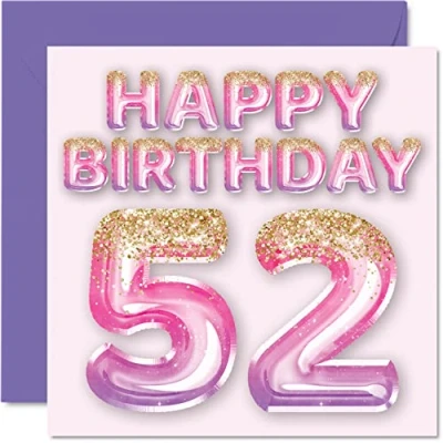 MAKE THEM SMILE WITH THIS AWESOME BIRTHDAY CARD: This exceptional quality birthday card for her shows the design of pink glitter balloons stating 'Happy Birthday 52'. If you are looking for funny birthday cards for women, then then this happy birthday card is bound to make them laugh. Not just for birthday gifts for women this could also be for Auntie, Sister, Cousin, Mum, Nanny, Grandma, Friend, or Colleague. WHAT DO YOU GET: The card is printed on one side and BLANK ON THE INSIDE to allow you to write your very own message. The unique fun design is printed on a specially sourced and environmentally responsible board. At 360 microns thick the natural white one-sided gloss board has a quality look and feel. Supplied with a coloured gummed envelope to complement the design and ready to be sealed and sent in the post. Birthday card for Nanny, 52nd birthday card for her. NO INK SMUDGES: There is nothing worse than writing inside a card to find that the shiny surface makes the ink smudge. This is why we use a high quality one sided coated board. The uncoated side will absorb more of the ink from your pen to make smudging a thing of the past. Nana birthday cards, Woman's birthday card, birthday card cute, 52nd birthday gifts for Women, 52nd birthday gifts for Granny, Cousin birthday cards. SIZES: Greeting Card = 145mm x 145mm, Envelope = 155mm x 155mm, Card Thickness = 360 micron. Great Mum birthday cards from Daughter or Son, female birthday card, 52nd birthday card, happy birthday Friend cards, Friends 52nd birthday cards, Cousin birthday card. MADE AND QUALITY CHECKED IN THE UK: We print and manufacture all our product right her in the UK so you can be sure of a fast turnaround and a product that is expertly made. Using environmentally responsible premium board our card is conscious of the responsible management of the world's forests - Grandparent 52nd birthday cards, Mother 52nd birthday cards, happy female birthday cards.