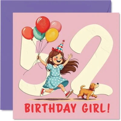 52nd Birthday Cards for Women Balloon Girl Happy Card 52 Year Old Woman Grandma Neighbour Auntie Friend, 145mm Bday Greeting