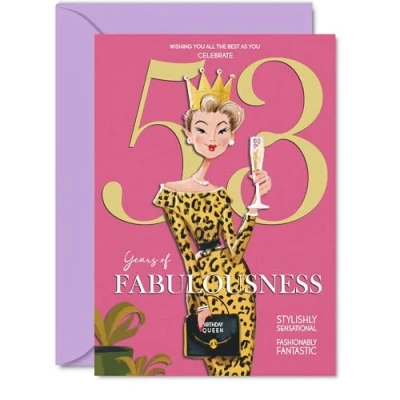 MAKE HER SMILE WITH THIS UNIQUE BIRTHDAY CARD: This exceptional quality birthday card for her shows the design 'Wishing you all the best as you celebrate 53 years of fabulousness'. If you are looking for special birthday greetings cards for Women birthday card then then this happy birthday card is bound to make her smile. Not just for birthday gifts for Women this could also be for Auntie, Cousin, Grandma, Wife, Friend, Sister, Colleague or Neighbour. WHAT DO YOU GET: The cards are printed on both sides with the inside print saying 'Have a Luminously Lovely Day' and ample space for your own personal message. The unique design is printed on a specially sourced and environmentally responsible board. At 360 microns thick the natural white one-sided gloss board has a quality look and feel. Supplied with a coloured gummed envelope to complement the design and ready to be sealed and sent in the post. NO INK SMUDGES: There is nothing worse than writing inside a card to find that the shiny surface makes the ink smudge. This is why we use a high quality one sided coated board. The uncoated side will absorb more of the ink from your pen to make smudging a thing of the past. 53rd Birthday card for Grandma, 53rd Birthday card for Wife, 53rd Birthday card for Friend. SIZES: Greeting Card = 127mm x 178mm, Envelope = 130mm x 180mm, Card Thickness = 360 micron. Sister 53rd birthday card, birthday cards for Colleague, cute birthday cards for Neighbour, 53rd birthday card Auntie, Cousin 53rd birthday card. MADE AND QUALITY CHECKED IN THE UK: We print and manufacture all our products right here in the UK so you can be sure of a fast turnaround and a product that is expertly made. Using environmentally responsible premium board our card is conscious of the responsible management of the world's forests - perfect birthday cards for Women, fun birthday cards for her, Cousin 53rd birthday cards, female birthday cards.
