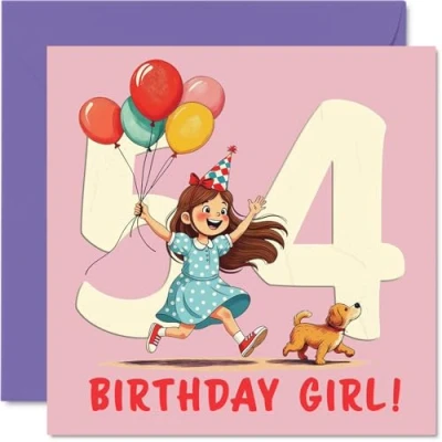 54th Birthday Cards for Women Balloon Girl Happy Card 54 Year Old Woman Colleague Sister Neighbour Grandma, 145mm Bday Greeting