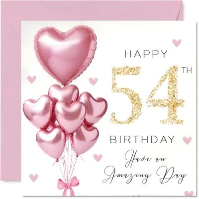 54th Birthday Cards for Women Pink Glitter Balloons Happy Card 54 Year Old Woman Grandma Colleague Neighbour Wife, 145mm Bday Greeting
