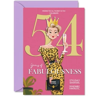 MAKE HER SMILE WITH THIS UNIQUE BIRTHDAY CARD: This exceptional quality birthday card for her shows the design 'Wishing you all the best as you celebrate 54 years of fabulousness'. If you are looking for special birthday greetings cards for Women birthday card then then this happy birthday card is bound to make her smile. Not just for birthday gifts for Women this could also be for Neighbour, Nanny, Sister, Wife, Daughter, Colleague, Cousin or Friend. WHAT DO YOU GET: The cards are printed on both sides with the inside print saying 'Have a Luminously Lovely Day' and ample space for your own personal message. The unique design is printed on a specially sourced and environmentally responsible board. At 360 microns thick the natural white one-sided gloss board has a quality look and feel. Supplied with a coloured gummed envelope to complement the design and ready to be sealed and sent in the post. NO INK SMUDGES: There is nothing worse than writing inside a card to find that the shiny surface makes the ink smudge. This is why we use a high quality one sided coated board. The uncoated side will absorb more of the ink from your pen to make smudging a thing of the past. 54th Birthday card for Sister, 54th Birthday card for Wife, 54th Birthday card for Daughter. SIZES: Greeting Card = 148mm x 210mm, Envelope = 150mm x 212mm, Card Thickness = 360 micron. Colleague 54th birthday card, birthday cards for Cousin, cute birthday cards for Friend, 54th birthday card Neighbour, Nanny 54th birthday card. MADE AND QUALITY CHECKED IN THE UK: We print and manufacture all our products right here in the UK so you can be sure of a fast turnaround and a product that is expertly made. Using environmentally responsible premium board our card is conscious of the responsible management of the world's forests - perfect birthday cards for Women, fun birthday cards for her, Nanny 54th birthday cards, female birthday cards.
