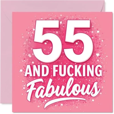 MAKE HER SMILE WITH THIS UNIQUE BIRTHDAY CARD: This exceptional quality birthday card for her shows the design '55 AND FUCKING FABULOUS'. If you are looking for special birthday greetings cards for Women birthday card then then this happy birthday card is bound to make her smile. Not just for birthday gifts for Women this could also be for Neighbour, Colleague, Sister, Nanny, Wife, Daughter, Cousin or Nan. WHAT DO YOU GET: The card is printed on one side and BLANK ON THE INSIDE to allow you to write your very own message. The unique fun design is printed on a specially sourced and environmentally responsible board. At 360 microns thick the natural white one-sided gloss board has a quality look and feel. Supplied with a coloured gummed envelope to complement the design and ready to be sealed and sent in the post. Great Neighbour birthday cards, 55th birthday card, Colleague birthday card. NO INK SMUDGES: There is nothing worse than writing inside a card to find that the shiny surface makes the ink smudge. This is why we use a high quality one sided coated board. The uncoated side will absorb more of the ink from your pen to make smudging a thing of the past. 55th Birthday card for Sister, 55th Birthday card for Nanny, 55th Birthday card for Wife. SIZES: Greeting Card = 145mm x 145mm, Envelope = 155mm x 155mm, Card Thickness = 360 micron. Daughter 55th birthday card, birthday cards for Cousin, cute birthday cards for Nan, 55th birthday card Neighbour, Colleague 55th birthday card. MADE AND QUALITY CHECKED IN THE UK: We print and manufacture all our products right here in the UK so you can be sure of a fast turnaround and a product that is expertly made. Using environmentally responsible premium board our card is conscious of the responsible management of the world's forests - perfect birthday cards for Women, fun birthday cards for her, Colleague 55th birthday cards, female birthday cards.