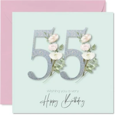 MAKE HER SMILE WITH THIS UNIQUE BIRTHDAY CARD: This exceptional quality birthday card for her shows the design '55 Wishing You A Very Happy Birthday'. If you are looking for special birthday greetings cards for Women birthday card then then this happy birthday card is bound to make her smile. Not just for birthday gifts for Women this could also be for Wife, Friend, Cousin, Nanny, Nan, Grandma, Auntie or Daughter. WHAT DO YOU GET: The card is printed on one side and BLANK ON THE INSIDE to allow you to write your very own message. The unique fun design is printed on a specially sourced and environmentally responsible board. At 360 microns thick the natural white one-sided gloss board has a quality look and feel. Supplied with a coloured gummed envelope to complement the design and ready to be sealed and sent in the post. Great Wife birthday cards, 55th birthday card, Friend birthday card. NO INK SMUDGES: There is nothing worse than writing inside a card to find that the shiny surface makes the ink smudge. This is why we use a high quality one sided coated board. The uncoated side will absorb more of the ink from your pen to make smudging a thing of the past. 55th Birthday card for Cousin, 55th Birthday card for Nanny, 55th Birthday card for Nan. SIZES: Greeting Card = 145mm x 145mm, Envelope = 155mm x 155mm, Card Thickness = 360 micron. Grandma 55th birthday card, birthday cards for Auntie, cute birthday cards for Daughter, 55th birthday card Wife, Friend 55th birthday card. MADE AND QUALITY CHECKED IN THE UK: We print and manufacture all our products right here in the UK so you can be sure of a fast turnaround and a product that is expertly made. Using environmentally responsible premium board our card is conscious of the responsible management of the world's forests - perfect birthday cards for Women, fun birthday cards for her, Friend 55th birthday cards, female birthday cards.
