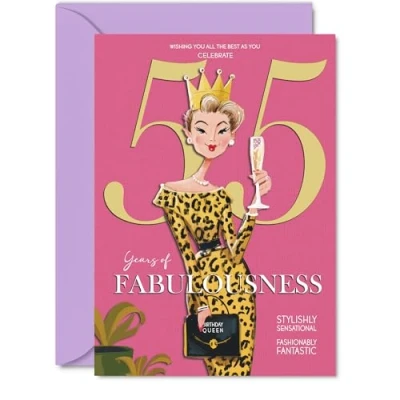 MAKE HER SMILE WITH THIS UNIQUE BIRTHDAY CARD: This exceptional quality birthday card for her shows the design 'Wishing you all the best as you celebrate 55 years of fabulousness'. If you are looking for special birthday greetings cards for Women birthday card then then this happy birthday card is bound to make her smile. Not just for birthday gifts for Women this could also be for Grandma, Wife, Friend, Sister, Colleague, Neighbour, Daughter or Nanny. WHAT DO YOU GET: The cards are printed on both sides with the inside print saying 'Have a Luminously Lovely Day' and ample space for your own personal message. The unique design is printed on a specially sourced and environmentally responsible board. At 360 microns thick the natural white one-sided gloss board has a quality look and feel. Supplied with a coloured gummed envelope to complement the design and ready to be sealed and sent in the post. NO INK SMUDGES: There is nothing worse than writing inside a card to find that the shiny surface makes the ink smudge. This is why we use a high quality one sided coated board. The uncoated side will absorb more of the ink from your pen to make smudging a thing of the past. 55th Birthday card for Friend, 55th Birthday card for Sister, 55th Birthday card for Colleague. SIZES: Greeting Card = 127mm x 178mm, Envelope = 130mm x 180mm, Card Thickness = 360 micron. Neighbour 55th birthday card, birthday cards for Daughter, cute birthday cards for Nanny, 55th birthday card Grandma, Wife 55th birthday card. MADE AND QUALITY CHECKED IN THE UK: We print and manufacture all our products right here in the UK so you can be sure of a fast turnaround and a product that is expertly made. Using environmentally responsible premium board our card is conscious of the responsible management of the world's forests - perfect birthday cards for Women, fun birthday cards for her, Wife 55th birthday cards, female birthday cards.