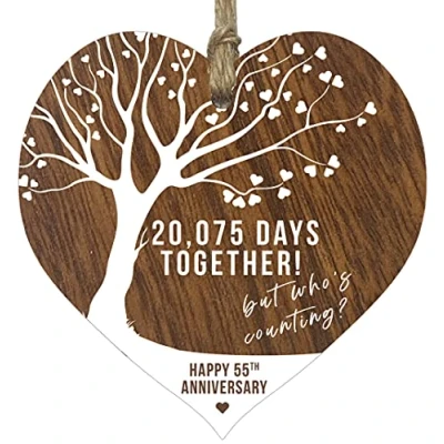 HANDMADE WOODEN ANNIVERSARY GIFTS: This exceptional quality i love you gifts for her heart shaped wedding wooden plaque shows the design: "20075 Days Together, But Who's Counting? Happy 55th Anniversary" If you are looking for the perfect i love you gift then then this hanging wooden decoration is bound to make them smile. Soulmate gifts for her and friends cake decorations. EVERY HEART IS TRUELY UNIQUE: Unlike other brands our beautiful plaques are made from raw wood and not a laminated MDF. This means that every single heart will have it's own pattern and indentation from the grain of the wood used. Each heart is hand finished with a lacquer varnish that really accentuates the deep colour of the wood and also makes the ink of the pattern/text clearer and brighter in colour. WHAT DO YOU GET: This anniversary sign is made from the highest quality wooden signs and plaques. Love heart gifts for boyfriend but that can be used for any occasion from Birthdays, Valentines, Christmas and obviously for the actual anniversary date. It can be used to hang around a champagne, wine & spirits bottle. Versatile and well-made personalised gifts for girls from Stuff4 Ltd. Mum and Dad wedding anniversary gift. MADE AND QUALITY CHECKED IN THE UK: We manufacture all our product right her in the UK so you can be sure of a fast turnaround and a product that is expertly made - some things i still can't tell you poems. We have the perfect 1st 2nd 3rd 4th 5th 6th 7th 8th 9th 10th 11th 12th 13th 14th 15th 16th 17th 18th 19th 20th 25th 30th 35th 40th 45th 50th 55th 60th 65th 70th wedding anniversary gifts for wife. This beautiful heart can be used at any time to say you are the reason. EASY TO HANG: Our hanging wooden heart love quotes plaques comes equipped with a small jute twine, which can be then used to hang it on somewhere for decoration. The wooden sign is convenient for you to assemble without spending your too much effort and time. Wedding decorations for house.