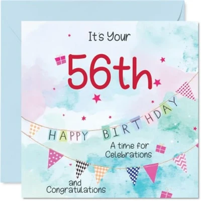 MAKE HIM SMILE WITH THIS UNIQUE BIRTHDAY CARD: This exceptional quality birthday card for him shows the design 'Its your 56th Happy Birthday A time for celebrations and congratulations'. If you are looking for special birthday greetings cards for Men birthday card then then this happy birthday card is bound to make him smile. Not just for birthday gifts for Men this could also be for Son, Friend, Brother, Uncle, Cousin, Nephew, Husband or Neighbour. WHAT DO YOU GET: The card is printed on one side and BLANK ON THE INSIDE to allow you to write your very own message. The unique fun design is printed on a specially sourced and environmentally responsible board. At 360 microns thick the natural white one-sided gloss board has a quality look and feel. Supplied with a coloured gummed envelope to complement the design and ready to be sealed and sent in the post. Great Son birthday cards, 56th birthday card, Friend birthday card. DESIGNED FOR WRITING: There is nothing worse than writing inside a card to find that the shiny surface makes the ink smudge. This is why we use a high quality one sided coated board. The uncoated side will absorb more of the ink from your pen to make smudging a thing of the past. 56th Birthday card for Brother, 56th Birthday card for Uncle, 56th Birthday card for Cousin. SIZES: Greeting Card = 145mm x 145mm, Envelope = 155mm x 155mm, Card Thickness = 360 micron. Nephew 56th birthday card, birthday cards for Husband, cute birthday cards for Neighbour, 56th birthday card Son, Friend 56th birthday card. MADE AND QUALITY CHECKED IN THE UK: We print and manufacture all our products right here in the UK so you can be sure of a fast turnaround and a product that is expertly made. Using environmentally responsible premium board our card is conscious of the responsible management of the world's forests - perfect birthday cards for Men, fun birthday cards for him, Friend 56th birthday cards, female birthday cards.