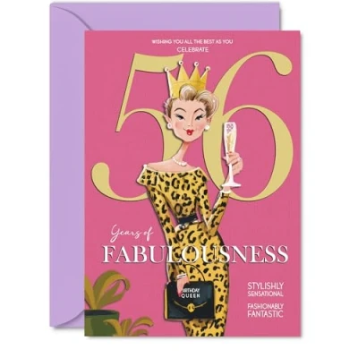 MAKE HER SMILE WITH THIS UNIQUE BIRTHDAY CARD: This exceptional quality birthday card for her shows the design 'Wishing you all the best as you celebrate 56 years of fabulousness'. If you are looking for special birthday greetings cards for Women birthday card then then this happy birthday card is bound to make her smile. Not just for birthday gifts for Women this could also be for Wife, Friend, Sister, Colleague, Neighbour, Daughter, Nanny or Nan. WHAT DO YOU GET: The cards are printed on both sides with the inside print saying 'Have a Luminously Lovely Day' and ample space for your own personal message. The unique design is printed on a specially sourced and environmentally responsible board. At 360 microns thick the natural white one-sided gloss board has a quality look and feel. Supplied with a coloured gummed envelope to complement the design and ready to be sealed and sent in the post. NO INK SMUDGES: There is nothing worse than writing inside a card to find that the shiny surface makes the ink smudge. This is why we use a high quality one sided coated board. The uncoated side will absorb more of the ink from your pen to make smudging a thing of the past. 56th Birthday card for Sister, 56th Birthday card for Colleague, 56th Birthday card for Neighbour. SIZES: Greeting Card = 127mm x 178mm, Envelope = 130mm x 180mm, Card Thickness = 360 micron. Daughter 56th birthday card, birthday cards for Nanny, cute birthday cards for Nan, 56th birthday card Wife, Friend 56th birthday card. MADE AND QUALITY CHECKED IN THE UK: We print and manufacture all our products right here in the UK so you can be sure of a fast turnaround and a product that is expertly made. Using environmentally responsible premium board our card is conscious of the responsible management of the world's forests - perfect birthday cards for Women, fun birthday cards for her, Friend 56th birthday cards, female birthday cards.