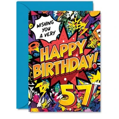 57th Birthday Cards for Men Women Comic Book Pow! Happy Card 57 Year Old Man Woman Husband Wife Daughter Neighbour, A5 Bday Greeting