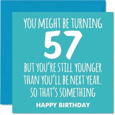 MAKE THEM SMILE WITH THIS @@@nZ21FmwZgHovakzx5W9H2NQoOfrB+IfZ@@@ BIRTHDAY CARD: This exceptional quality birthday card for him or her shows the design 'You might be turning 57 but youre still younger than youll be next year. So thats something HAPPY BIRTHDAY'. If you are looking for special birthday greetings cards for Men birthday card then this happy birthday card is bound to make them smile. Not just for birthday gifts for Men this could also be for Neighbour, Daughter, Husband, Wife, Uncle, Sister, Auntie or Grandad. WHAT DO YOU GET: The card is printed on one side and BLANK ON THE INSIDE to allow you to write your very own message. The unique fun design is printed on a specially sourced and environmentally responsible board. At 360 microns thick the natural white one-sided gloss board has a quality look and feel. Supplied with a coloured gummed envelope to complement the design and ready to be sealed and sent in the post. Great Neighbour birthday cards, Daughter birthday card. NO INK SMUDGES: There is nothing worse than writing inside a card to find that the shiny surface makes the ink smudge. This is why we use a high quality one sided coated board. The uncoated side will absorb more of the ink from your pen to make smudging a thing of the past. 57th Birthday card for Husband, 57th Birthday card for Wife, 57th Birthday card for Uncle. SIZES: Greeting Card = 145mm x 145mm, Envelope = 155mm x 155mm, Card Thickness = 360 micron. Sister 57th birthday card, birthday cards for Auntie, special birthday cards for Grandad, 57th birthday card Neighbour, Daughter 57th birthday card. MADE AND QUALITY CHECKED IN THE UK: We print and manufacture all our products right here in the UK so you can be sure of a fast turnaround and a product that is expertly made. Using environmentally responsible premium board our card is conscious of the responsible management of the world's forests - perfect birthday cards for Men, fun birthday cards for him, Daughter 57th birthday cards, female birthday cards.