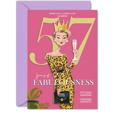 MAKE HER SMILE WITH THIS UNIQUE BIRTHDAY CARD: This exceptional quality birthday card for her shows the design 'Wishing you all the best as you celebrate 57 years of fabulousness'. If you are looking for special birthday greetings cards for Women birthday card then then this happy birthday card is bound to make her smile. Not just for birthday gifts for Women this could also be for Friend, Sister, Colleague, Neighbour, Daughter, Nanny, Nan or Auntie. WHAT DO YOU GET: The cards are printed on both sides with the inside print saying 'Have a Luminously Lovely Day' and ample space for your own personal message. The unique design is printed on a specially sourced and environmentally responsible board. At 360 microns thick the natural white one-sided gloss board has a quality look and feel. Supplied with a coloured gummed envelope to complement the design and ready to be sealed and sent in the post. NO INK SMUDGES: There is nothing worse than writing inside a card to find that the shiny surface makes the ink smudge. This is why we use a high quality one sided coated board. The uncoated side will absorb more of the ink from your pen to make smudging a thing of the past. 57th Birthday card for Colleague, 57th Birthday card for Neighbour, 57th Birthday card for Daughter. SIZES: Greeting Card = 127mm x 178mm, Envelope = 130mm x 180mm, Card Thickness = 360 micron. Nanny 57th birthday card, birthday cards for Nan, cute birthday cards for Auntie, 57th birthday card Friend, Sister 57th birthday card. MADE AND QUALITY CHECKED IN THE UK: We print and manufacture all our products right here in the UK so you can be sure of a fast turnaround and a product that is expertly made. Using environmentally responsible premium board our card is conscious of the responsible management of the world's forests - perfect birthday cards for Women, fun birthday cards for her, Sister 57th birthday cards, female birthday cards.