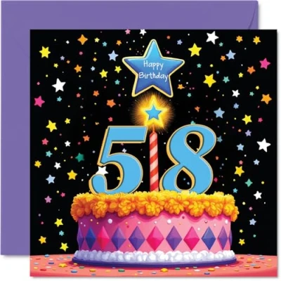 58th Birthday Cards for Men Women Pink Cake & Stars Happy Card 58 Year Old Man Woman Brother Nan Husband Cousin, 145mm Bday Greeting