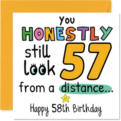 MAKE THEM SMILE WITH THIS UNIQUE BIRTHDAY CARD: This exceptional quality birthday card for him or her shows the design 'You Honestly still look 57 from a distance Happy 58th Birthday'. If you are looking for special birthday greetings cards for Men birthday card then then this happy birthday card is bound to make them smile. Not just for birthday gifts for Men this could also be for Neighbour, Brother, Dad, Friend, Wife, Colleague, Auntie or Son. WHAT DO YOU GET: The card is printed on one side and BLANK ON THE INSIDE to allow you to write your very own message. The unique fun design is printed on a specially sourced and environmentally responsible board. At 360 microns thick the natural white one-sided gloss board has a quality look and feel. Supplied with a coloured gummed envelope to complement the design and ready to be sealed and sent in the post. Great Neighbour birthday cards, Brother birthday card. NO INK SMUDGES: There is nothing worse than writing inside a card to find that the shiny surface makes the ink smudge. This is why we use a high quality one sided coated board. The uncoated side will absorb more of the ink from your pen to make smudging a thing of the past. 58th Birthday card for Dad, 58th Birthday card for Friend, 58th Birthday card for Wife. SIZES: Greeting Card = 145mm x 145mm, Envelope = 155mm x 155mm, Card Thickness = 360 micron. Colleague 58th birthday card, birthday cards for Auntie, special birthday cards for Son, 58th birthday card Neighbour, Brother 58th birthday card. MADE AND QUALITY CHECKED IN THE UK: We print and manufacture all our products right here in the UK so you can be sure of a fast turnaround and a product that is expertly made. Using environmentally responsible premium board our card is conscious of the responsible management of the world's forests - perfect birthday cards for Men, fun birthday cards for him, Brother 58th birthday cards, female birthday cards.