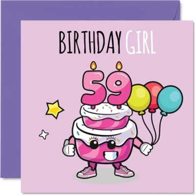 59th Birthday Cards for Women Cake Girl Balloons Happy Card 59 Year Old Woman Wife Colleague Nan Neighbour, 145mm Bday Greeting