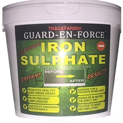 WHAT IS IRON SULPHATE? Iron Sulphate is Also Commonly Known as Ferrous Sulfate and Sulphate of Iron. Iron Sulphate is Highly Regarded by Keen Gardeners as a Lawn’s Best Friend. Both Professional and Domestic Users Apply Iron Sulphate as a Multi-Purpose Lawn Treatment. It Has a Wide Variety of Uses Such as Lawn Greening, Turf Hardening, Worm Casts, and Much More. Iron Sulphate is Renowned for its Use in Creating and Maintaining a Perfect, Strong, Healthy and Lush Green Lawn. HOW TO USE IRON SULPHATE? Iron Sulphate is Highly Regarded as an Essential Lawn Application in Both Spring and Autumn Seasons in Particular; but this Indispensable Lawn Product Can be Applied All Year Round to Maintain the Perfect Lawn. Iron Sulfate Can be Applied Wet or Dry. It is Applied Most Efficiently with a Knapsack Sprayer, or even a Watering Can. Simply Dilute with Warm Water to Make Solution for Sprayer or Can. Can also be applied Dry by Spreader, or Even Just Scattered by Hand. WHAT WILL IRON SULPHATE DO? There are Many Uses for Iron Sulphate on a Lawn or in the Garden. Green Keepers, Gardeners, Park Keepers, Sports Pitch Maintenance Operatives Use it For a Wide Range of Gardening, Grass, and Lawn Care Tasks. Iron Sulphate is an Iron Rich, Fast Acting, and Long Lasting Fertiliser That Will Encourage Strong Grass Growth and Healthy Dark Green Grass Colour. It is Often Applied to Create Superior Quality Golfing Greens. Iron Sulphate Will Also Help Prevent Lawn Disease. APPLICATION RATES: Iron Sulphate is Typically Applied at a Rate of Between 1 gram to 5 grams Per Square Metre, Depending on the Particular Use. 1 Kilogram of Our GUARD-EN-FORCE Iron Sulphate Will Usually Have a Coverage of 200 – 1000 Square Metres. Now that is a Garden Force with Value! Example Rates - Grass Greening can be Achieved by Applying Iron Sulphate to the Lawn at a Rate of 2 Grams per Square Metre. An Internet Search For Iron Sulphate Will Provide Lots of Information on Further Usage. WHY OUR IRON SULPHATE? Our Iron Sulphate is a premium quality, fine, dried powder, in Which Excess Water Molecules Have Been Removed. This gives More Product and More Power per Gram. The Powder Dilutes Down Easily With Lukewarm Water Into a Solution For Easy Application to Your Lawn. Our Re-sealable Clip Top Container Keeps the Sulphate Fresh and Dry for Use All Year Round. We have Over a Decade of Experience Which is Why Our Product is Used and Trusted by Gardening Experts and Enthusiasts.