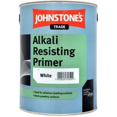 General description Johnstone's Trade Alkali Resisting Primer is a solvent-based primer and sealer designed for both interior and exterior applications. It is ideal for use on new or bare plaster, concrete, cement, render, wood, and metal surfaces. This primer offers exceptional resistance to alkali attack, making it suitable for unpainted surfaces and effective as a sealer on powdery substrates. Technical specifications Type: Solvent Based Application Finish: Matt Coverage: 9 - 11 sqm per litre Recoatable: 16 - 24 hours under normal drying conditions Usage Apply the primer on various substrates including blockwork, brickwork, cement render, concrete, and plaster to ensure a durable and protective base for subsequent paint layers.