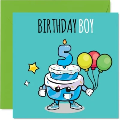MAKE HIM SMILE WITH THIS UNIQUE BIRTHDAY CARD: This exceptional quality birthday card for him shows the design 'Birthday Boy 5'. If you are looking for special birthday greetings cards for Boys birthday card then then this happy birthday card is bound to make him smile. Not just for birthday gifts for Boys this could also be for Godson, Great Nephew, Step Son, Cousin, Son, Nephew, Grandson or Brother. WHAT DO YOU GET: The card is printed on one side and BLANK ON THE INSIDE to allow you to write your very own message. The unique fun design is printed on a specially sourced and environmentally responsible board. At 360 microns thick the natural white one-sided gloss board has a quality look and feel. Supplied with a coloured gummed envelope to complement the design and ready to be sealed and sent in the post. Great Godson birthday cards, 5th birthday card, Great Nephew birthday card. NO INK SMUDGES: There is nothing worse than writing inside a card to find that the shiny surface makes the ink smudge. This is why we use a high quality one sided coated board. The uncoated side will absorb more of the ink from your pen to make smudging a thing of the past. 5th Birthday card for Step Son, 5th Birthday card for Cousin, 5th Birthday card for Son. SIZES: Greeting Card = 145mm x 145mm, Envelope = 155mm x 155mm, Card Thickness = 360 micron. Nephew 5th birthday card, birthday cards for Grandson, cute birthday cards for Brother, 5th birthday card Godson, Great Nephew 5th birthday card. MADE AND QUALITY CHECKED IN THE UK: We print and manufacture all our products right here in the UK so you can be sure of a fast turnaround and a product that is expertly made. Using environmentally responsible premium board our card is conscious of the responsible management of the world's forests - perfect birthday cards for Boys, fun birthday cards for him, Great Nephew 5th birthday cards, female birthday cards.