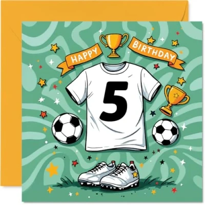 5th Birthday Cards for Boys Girls Football Shirt Happy Card 5 Year Old Boy Girl Son Grandson Niece Brother, 145mm Bday Greeting