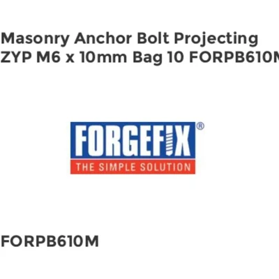 General description These Forgefix Masonry Anchor Projection Bolts are designed for heavy-duty fixing applications in masonry. They feature a Zinc Yellow Passivated finish that enhances durability and resistance to corrosion, making them suitable for various securing tasks. Technical specifications Thread size: M6 Maximum fixing thickness: 10mm Finish: Zinc Yellow Passivated Pack quantity: 10 pieces Part number: FORPB610M EAN: 5028485459088 Compatibility and accessories Compatible with standard socket drives and spanners suitable for M6 bolts Use with appropriate expansion shields and fixing tools for masonry Installation Ensure the correct size of socket drive or spanner is used for accurate installation Drill a hole in the masonry to the required depth, matching the bolt size Insert the bolt into the hole and tighten to expand the shield securely into the masonry Use the retaining spring to encapsulate the wedge during expansion for added security Usage Secure reinforcement wall