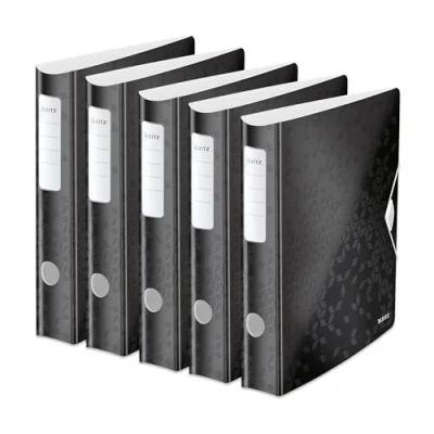 Versatile plastic folder in A4 format for filing up to 350 sheets (80 g/m²), spine width 6.5 cm, for home, school, office or on the go Easy labelling of the self-adhesive label, individual design of the labels thanks to Leitz EasyPrint on the Leitz homepage, elastic band closure for safe transport of your documents Unique, patented 180° precision mechanism for 50% wider opening and 20% faster double-sided storage, eye-catching design with geometric embossing provides the wow effect Lightweight polyfoam (2.8 mm), round back with finger hole for easier carrying, 3 inner pockets for loose documents, business cards and pen, protects the furniture thanks to the non-scratching surface Box contents: 5 x Leitz quality folders 180° Active WOW, 2 D-ring mechanism, dimensions (W x H x D): 6.5 x 31.8 x 30.8 cm, colour: black, WOW, 11070095 Versatile A4 plastic folder for filing up to 350 sheets (80 g/m²), spine width 6.5 cm, for home, school, office or on the go Easy labelling thanks to self-adhesive label, individual design of the labels thanks to Leitz EasyPrint on the Leitz homepage, elastic closure for safe transport of your documents Unique patented 180° precision mechanism for 50% wider opening and 20% faster double sided storage, eye catching design with geometric embossing provides the wow effect Lightweight poly foam (2.8mm), round back with finger hole for easier carrying