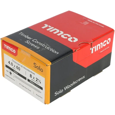 General description TIMco Solo woodscrews are designed for versatility, primarily used in various types of timber, man-made boards, and masonry with a plastic plug. They feature a special thread configuration that ensures high performance and excellent pull-out resistance, making them ideal for a range of applications. Technical specifications Size: 4.0 x 60mm Thread Design: Single thread Point Type: 25° Sharp Point Plating Options: Zinc & Yellow or Zinc & Clear Fully threaded up to 70mm Other information Cross recess double countersink available in both plating types.