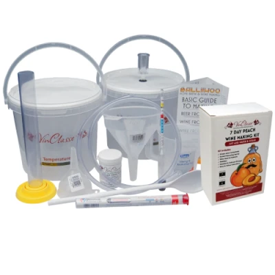 All The Basic Equipment Needed To Start Home Brewing 6 Bottles Of Wine & Includes A Peach Fruit Wine Ingredient Kit With Full Instructions. Only Sugar and Water Required, Ready to Drink in About 2-3 weeks. The Kit Includes 2 x 5 Litre Opaque Fermenting Buckets With Graduation Marks & Temperature Strips - 2 Lids, One Of Which Has A Grommet & Airlock - 1.25m Syphon Tube. Long Handled Plastic Spoon - Plastic Measuring Jug & 2 Funnels - VinClasse Cleaner Steriliser - Hydrometer & Trial Jar. Once Your Wine Has Finished Fermenting You Will Require Bottles, Corks & Corker (Not Included) But Also Available From "Balliihoo Homebrew" Alternatvely Keep Back & Re Use Your Old Screw Cap Wine Bottles. Tony's TipsGreat as a gift and even greater as a bit of Selfish Personal Indulgence, this is definitely the way to produce low cost Fruit Wine of the Peach variety, offering great taste, great value and lots of it! No matter what the occasion, mastery of the techniques of fine Wine making can be gained with ease by anyone who has a thirst for quality wine at low cost (just about Anybody and Everybody then!) Tip: Get the Book "First Steps in Winemaking" by C.J.J.Berry, available on this Balliihoo website, there is nothing to stop experimentation with mixing or adding extra ingredients to further enhance the wine character. Let me know your findings!