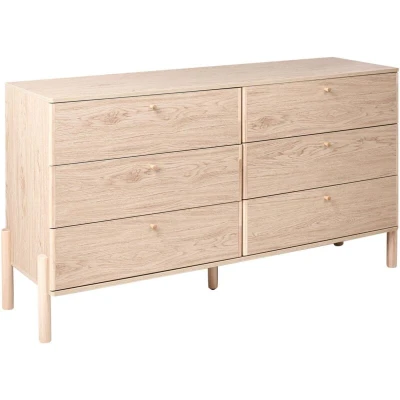 Chest of Drawers with Natural Wood Look. Complete your bedroom or living area with this stylish and practical chest of drawers. Made from durable particle board with solid wood legs and handles, it features a finish that highlights the warm, natural look of wood grain. Six spacious drawers offer convenient storage for everyday essentials, helping keep your space tidy and organised. Details: Product Type: Chest of Drawers Style: Scandinavian General Color: Brown Shade: Light Brown Material Type: Engineered Wood Main Material: Particle Board Additional Material: Pine Wood Legs material: Wood Drawers: Yes Finish: Paper Veneer Number of Drawers: 6 Shelves: No Dimensions: Depth: 46 cm Width: 156 cm Height: 86 cm Weight: 61 kg Drawer Weight Capacity: 10 kg Top Weight Capacity: 30 kg Offer Includes: 1 x Chest of Drawers Key Features: Minimalistic, Scandinavian Style, Decorative Yet Functional, Eye-Catching Accent Piece, Wood-like Finish for Natural Look, High-Quality Materials, For Best