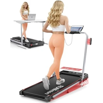 【6-in-1 Adjustable Speed Foldable Treadmill with 9% Incline】The RUNIMON folding walking pad treadmill is suitable for at least six different scenarios, including fat-burning mode, walking mode, running mode, office mode, physical therapy & rehabilitation, and pet training. When the handle are raised, the speed range is adjustable from 1-12KM/H; when the handle are lowered, the speed range is adjustable from 1-8KM/H. The electric flat treadmill for home also features an 9% incline, which can be used in both configurations to meet your various exercise needs 【2.5HP High-Power Low-Noise Motor & Magnetic Remote Control】The walking pad treadmills is equipped with a powerful 2.5 HP silent motor, offering stable performance and high load capacity. Adjust the support bolts in the middle of the treadmill mat to ensure it contacts the ground for a more stable workout experience. The folding treadmill comes with a magnetic remote control that can be easily placed on the treadmill handlebars, so you never have to worry about losing the remote 【Double Display & Smart App Support】Our running pad treadmill for home features two LED large screens that capture your workout status in real-time and record your exercise data. It can also connect via Bluetooth to apps like "FITSHOW," "KINOMAP," and "ZWIFT" to control and track your workout data, which you can share on your social media platforms. Additionally, it includes various training courses. You can place your phone or tablet on the treadmill holder to follow workout sessions or enjoy movies and music while having a wonderful workout experience 【Multiple Shock Absorption & Safety Lock】The folding walking pad treadmill with handle for home is equipped with a large five-layer non-slip textured running surface (1000x400mm), capable of supporting up to 260lbs/120kg. The running machine features 10 silicone shock absorbers and 2 soft rubber pads, providing effective and safe shock absorption to protect your knees and muscles. The safety lock ensures that you can immediately stop the treadmill in case of an emergency, preventing potential injuries 【No Assembly, Easy to Use, Place&Store】Our compact treadmill for home and office use with a no-assembly design, ready to use immediately. Product Size: 1270*584*1073 mm(include PAD bracket), Folding Size:1270*584*114mm(including PAD bracket).Weight: 21.1 kg. The foldable treadmill is lightweight and features two front wheels, allowing women to move it easily. The slim treadmill can be placed under the bed or sofa to store for small space. The lubrication hole in the upper right corner makes maintenance more convenient.