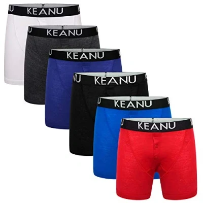COTTON BLEND: 50% Cotton, 50% Polyester Button Front Boxer Shorts by Keanu! Soft on the skin with a cotton blend ribbed construction, stretch jersey that offers high levels of comfort, breathability and durability. 6 COLOUR PACK: 6 Colour Boxers with Elasticated Black waistband, featuring Keanu jacquard on the waistband in white as per images SHOP THE KEANU COLLECTION: Complete your wardrobe with our other Keanu products - Coordinating clothing, nightwear and accessories available. UK SIZES: Available in Sizes, Small, Medium, Large, Extra Large and Double Extra Large