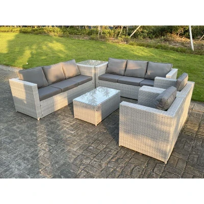 General description This deluxe rattan sofa set is a great addition to your patio or garden. It is made of high-quality PE rattan and features a durable galvanized steel construction, ensuring sturdiness and longevity. This furniture set can be left outdoors all year round. Technical specifications Set Dimensions: 2 x Sofa with double armrest: 177W x 65D x 66H cm 2 x Armchairs: 74L x 65W x 66H cm 1 x Side coffee table: 65L x 65W x 66H cm 1 x Oblong coffee table: 85L x 50W x 37H cm Material: Light grey mixed rattan with dark grey fabric Thickness of PE rattan: 5mm Thickness of seat cushion: 8 cm Glass top: 5mm clear tempered glass with suckers to prevent sliding Installation Items come flat packed; self-assembly is necessary. Usage Low maintenance required. Removable cushion covers for easy cleaning. Recommended to keep cushions indoors or use a rain cover when not in use. Use a rain cover for the furniture if not in use for an extended period. Other information Factory direct sale