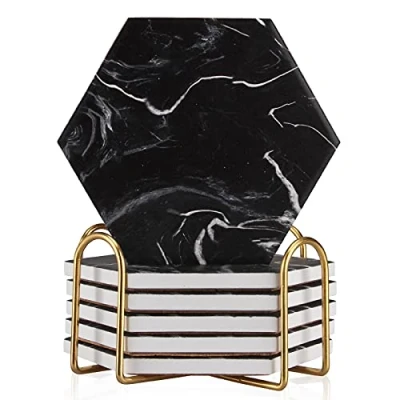 6 Pcs Cool Black Marble Coasters with Holder Hexagon Absorbent Modern Ceramic Coaster Set Best Stone Drink Beverage Coffee Table Cup Bar