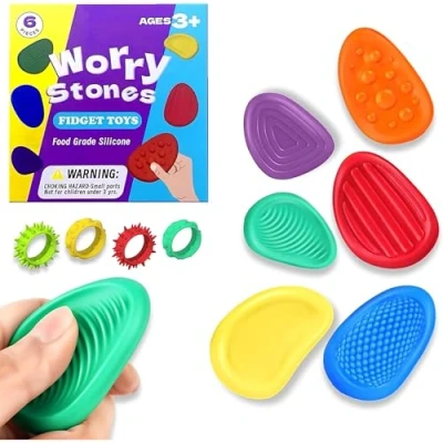 This fidget set is specially designed to provide a calming outlet for stress and anxiety. The smooth sensory stones and soft rings help soothe the nervous system, making them ideal for kids and adults who need a moment of calm during overwhelming situations. Perfect for individuals with ADHD or trouble concentrating, these sensory tools offer a tactile and repetitive motion that helps channel excess energy, allowing the brain to stay focused longer during work, school, or therapy sessions. Whether at home or on the go, this set offers quiet sensory input for individuals with autism who need help regulating emotions or sensory overload. The textures and shapes are crafted to engage without overstimulating, helping promote self-regulation and calm. Unlike noisy fidget toys, these sensory stones and sensory rings are silent, making them an excellent choice for classrooms, offices, therapy rooms, or libraries. They allow for fidgeting and relief without drawing attention or causing distractions. Recommended Calming Tools – Supports sensory development and focus for children and adults, recommended for occupational and behavioral therapy., Manufacturer: Daskid