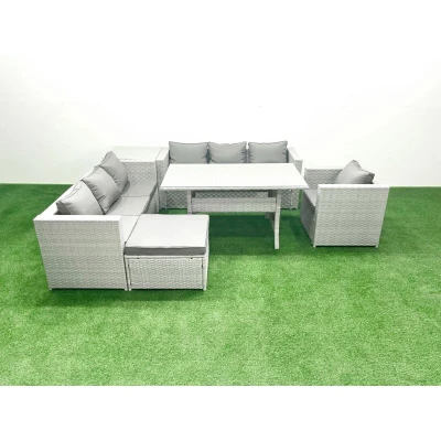 General description This deluxe rattan sofa set is an excellent addition to your patio or garden. It is made of high-quality PE rattan and features a durable galvanized steel construction, ensuring sturdiness and longevity. This furniture set is designed for outdoor use all year round. Technical specifications Set Dimensions: 2 x Sofa with double armrest: 177W x 65D x 66H cm 1 x Armchair: 74L x 65W x 66H cm 1 x Side coffee table: 65L x 65W x 66H cm 1 x Big footstool: 65L x 65W x 34H cm 1 x Rectangular Dining Table: 140L x 80W x 69H cm Color: Light grey mixed rattan with dark grey fabric Seat Cushion Thickness: 8 cm Installation Items come flat packed and are easy to assemble. Sturdy galvanized steel tube metal frames with powder coating to prevent rust. Usage Low maintenance required. Removable cushion covers for easy cleaning. Recommended to keep cushions indoors or use a rain cover when not in use. Use a rain cover if the furniture is not used for an extended period. Other