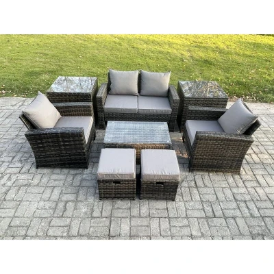 6 Seater Dark Grey Outdoor Rattan Garden Furniture Set Patio Lounge Sofa Rectangular Coffee Table with 2 Side Small Footstools Fimous