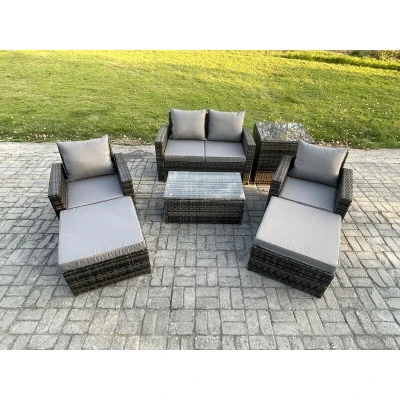 6 Seater Dark Grey Outdoor Rattan Garden Furniture Set Patio Lounge Sofa Rectangular Coffee Table with Side 2 Big Footstool Fimous
