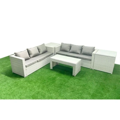 6 Seater Garden Outdoor Rattan Furniture Set Sofa Oblong Coffee Table with 2 Side Tables Light Grey Mixed Fimous