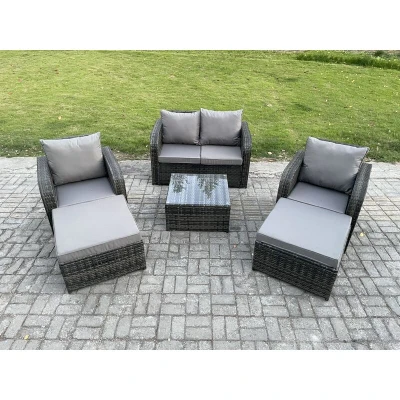 General description This 6-seater deluxe garden furniture set enhances the beauty of your courtyard, deck, backyard, porch, or swimming pool. Constructed from high-quality PE rattan and durable galvanized steel, it is designed to withstand adverse weather conditions in the UK. The set can be easily reconfigured to suit your needs at any time. Technical specifications Set includes: 2 x Big footstools: 65L x 65W x 34H cm 2 x Reclining chairs: 74L x 67W x 79H cm 1 x Love sofa: 124W x 67D x 79H cm 1 x Square coffee table: 65L x 65W x 34H cm Color: Dark grey mixed rattan with dark grey fabric Seat cushion thickness: 8 cm Installation Items come flat packed and are easy to assemble. Sturdy galvanized steel tube metal frames with powder coating to prevent rust. Usage The reclining chairs are adjustable, allowing you to change the backrest inclination from 90° to 130°. Removable cushion covers for easy maintenance. Keep cushions indoors or use a rain cover when not in use. Use a rain cover to