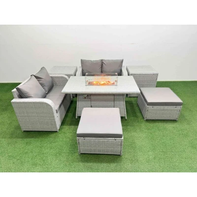 General description This Fimous 6 Seater Outdoor Love Sofa Set is a stylish and functional addition to your garden or patio. Made from light grey PE rattan with dark grey fabric, this set includes two love sofas, two side tables, two footstools, and a firepit dining table. The furniture is designed for comfort and durability, featuring thick cushions and a sturdy galvanized steel frame. Technical specifications Set Dimensions: 2 x Love Sofa: 124W x 67D x 79H cm 2 x Side Table: 65L x 65W x 66H cm 2 x Big Footstool: 65L x 65W x 34H cm 1 x Firepit Dining Table: 140L x 80W x 69H cm Material: Light grey PE rattan with dark grey fabric Seat Cushion Thickness: 8 cm Glass Top: 5 mm thickness transparent tempered glass Installation Items come flat packed and are easy to assemble. Includes sturdy galvanized steel tube metal frames with powder coating to prevent rust. Usage Place the gas fire pit on the glass top, not under it. Use a 5 kg gas tank for optimal performance. Check for any gas leaks