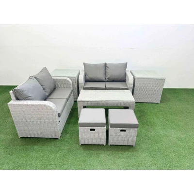 6 Seater Outdoor Love Sofa Set Rattan Garden Furniture with Oblong Coffee Table 2 Small Stools Side Tables Light Grey Fimous