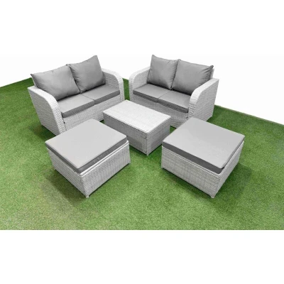 6 Seater Outdoor Love Sofa Set Rattan Garden Furniture with Rectangular Coffee Table 2 Footstool Light Grey Fimous