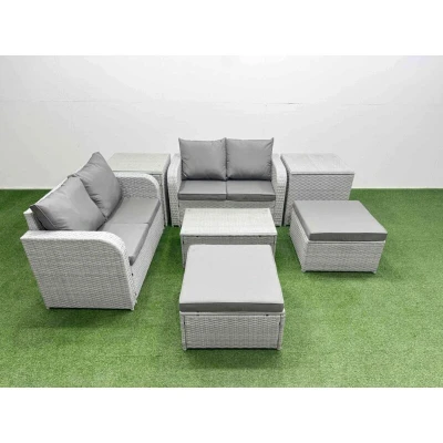 6 Seater Outdoor Love Sofa Set Rattan Garden Furniture with Rectangular Coffee Table 2 Footstool Side Tables Light Grey Fimous