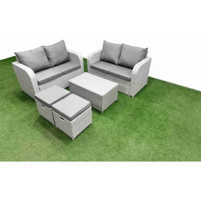 6 Seater Outdoor Love Sofa Set Rattan Garden Furniture with Rectangular Coffee Table 2 Small Stools Light Grey Fimous