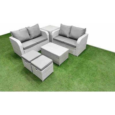 6 Seater Outdoor Love Sofa Set Rattan Garden Furniture with Rectangular Coffee Table 2 Small Stools Side Light Grey Fimous