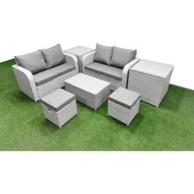 6 Seater Outdoor Love Sofa Set Rattan Garden Furniture with Rectangular Coffee Table 2 Small Stools Side Tables Light Grey Fimous