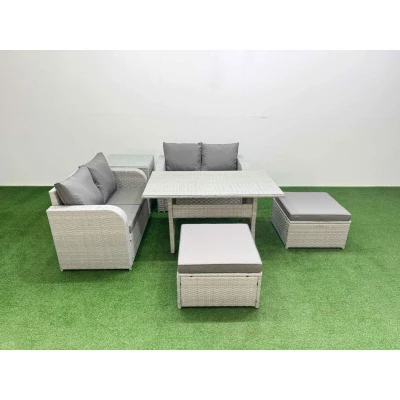 6 Seater Outdoor Love Sofa Set Rattan Garden Furniture with Rectangular Dining Table 2 Footstool Side Light Grey Fimous